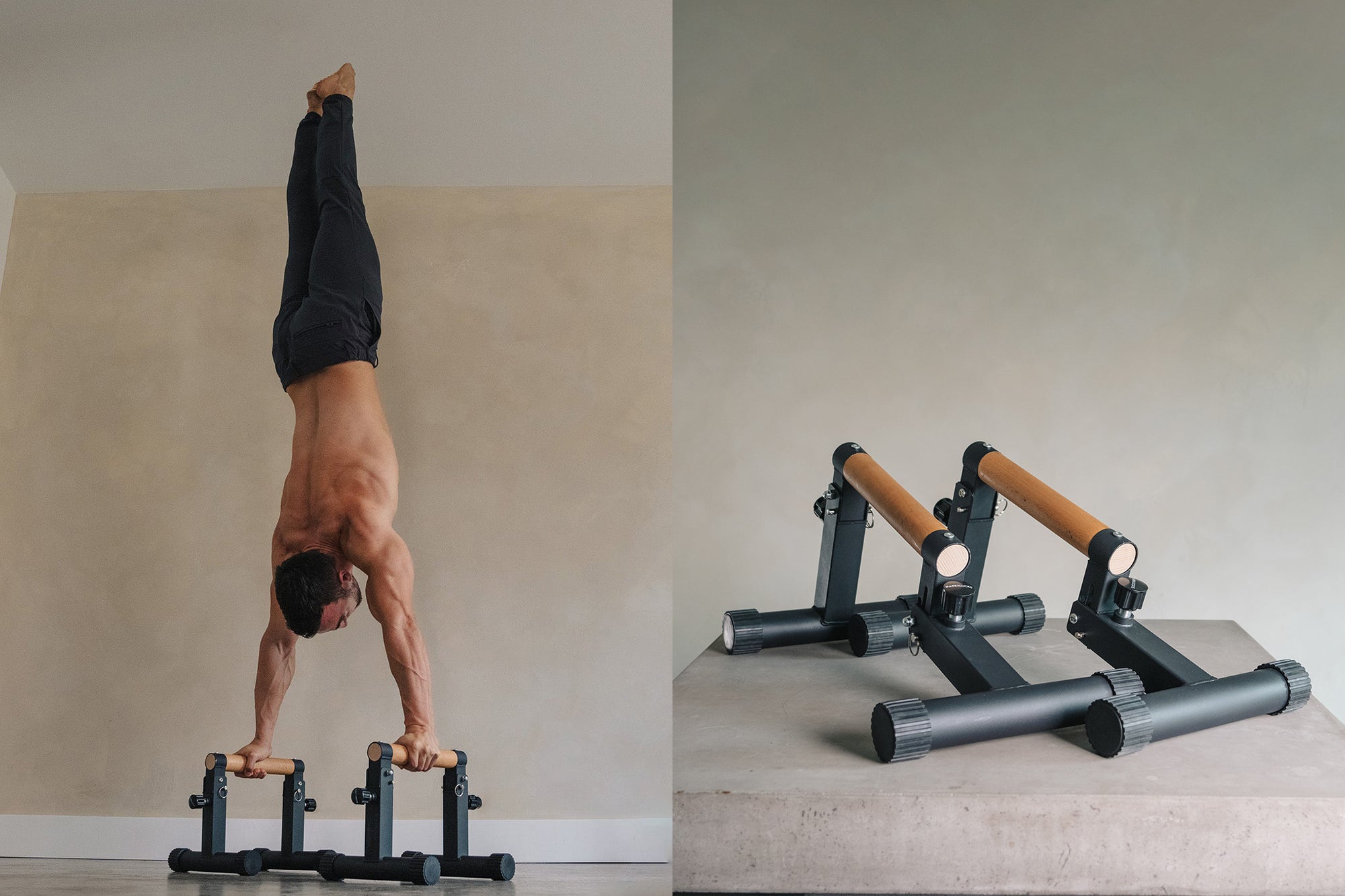 Nuestras parallettes modulares con tres opciones de configuración diferentes: alta (30cm), baja (14cm) e inclinada(18°). Mangos de contrachapado de abedul que hacen que tu agarre sea más cómodo.