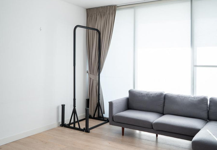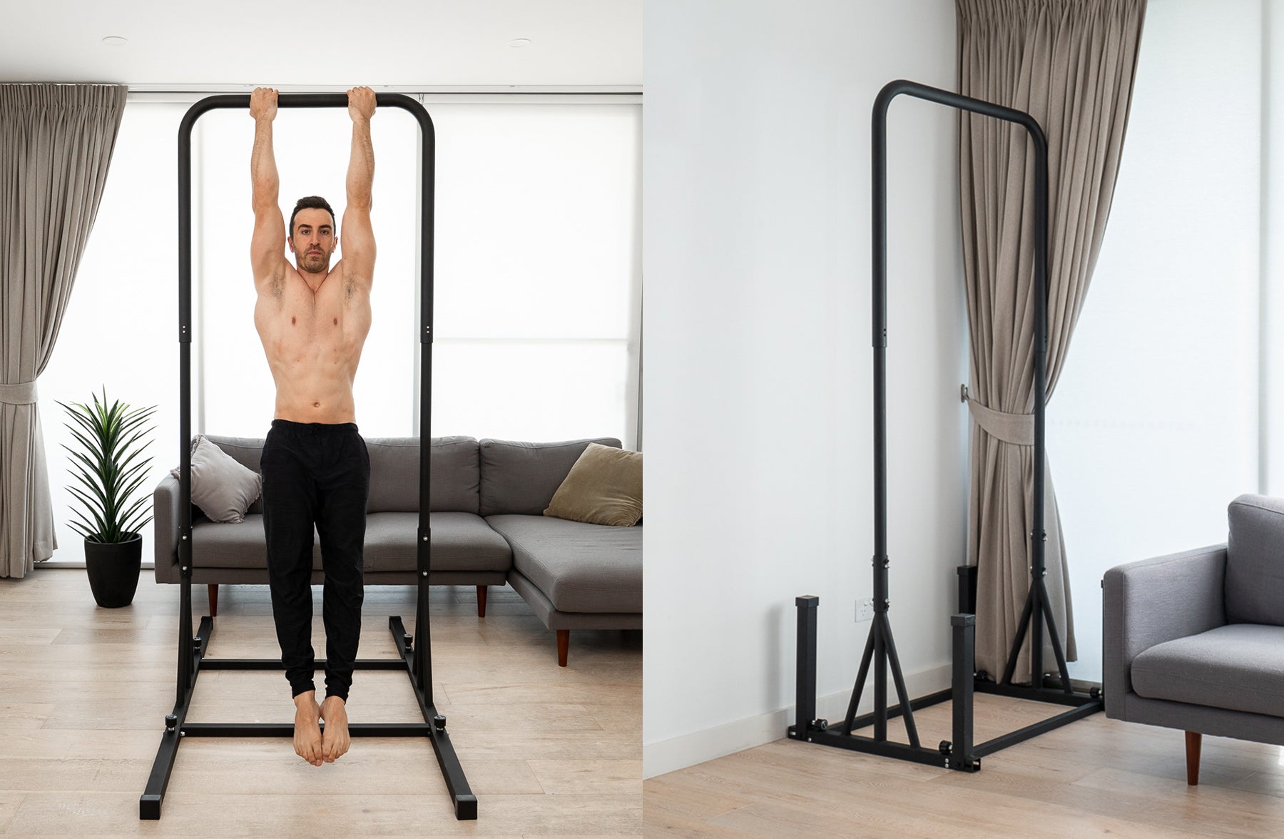 La Big Bar mide 205cm de altura, lo que te permite realizar ejercicios desde un dead hang. Patas plegables ligeras para un almacenamiento compacto y una altura alternativa de 112cm para el entrenamiento de muscle-up.